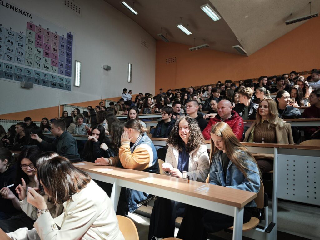 „Dva stoljeća aromatičnosti: Kako je jedna molekula oblikovala modernu civilizaciju?“ koje je održano 22.4.2026. godine na prirodno matematičkom fakultetu. Predavanju je prisustvovalo šest učenika članova sekcije “Mladi hemičari”. Učenici su nakon predavanja obišli prostorije i katedre fakulteta i upoznali se sa načinom rada na fakultetu, odsjeku za hemiju.