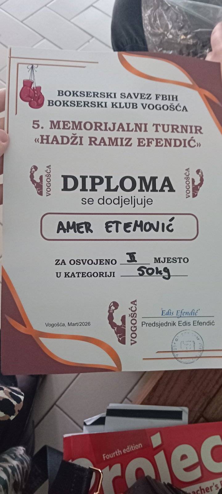 Na 5. memorijalnom turniru „Hadži Ramiz Efendić“, održanom 28.03.2026. godine u okviru 2. kola Federalne lige, naš učenik Amer Etemović VI3, ostvario je zapažen rezultat. Takmičeći se u kategoriji pionira do 50 kg, Amer je zauzeo odlično drugo mjesto, pokazavši borbenost, trud i sportski duh. Čestitamo našem učeniku na uspjehu i želimo mu još mnogo dobrih rezultata u budućim takmičenjima.